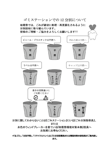 環境対策本部は、収穫祭時の環境負荷軽減のため、ごみ捨て場の管理や、ゴミの分別が適切にできているか確認を行います!円滑な運営を行うために、来場者の皆様におかれましても、分別のご協力をお願いいたします!
