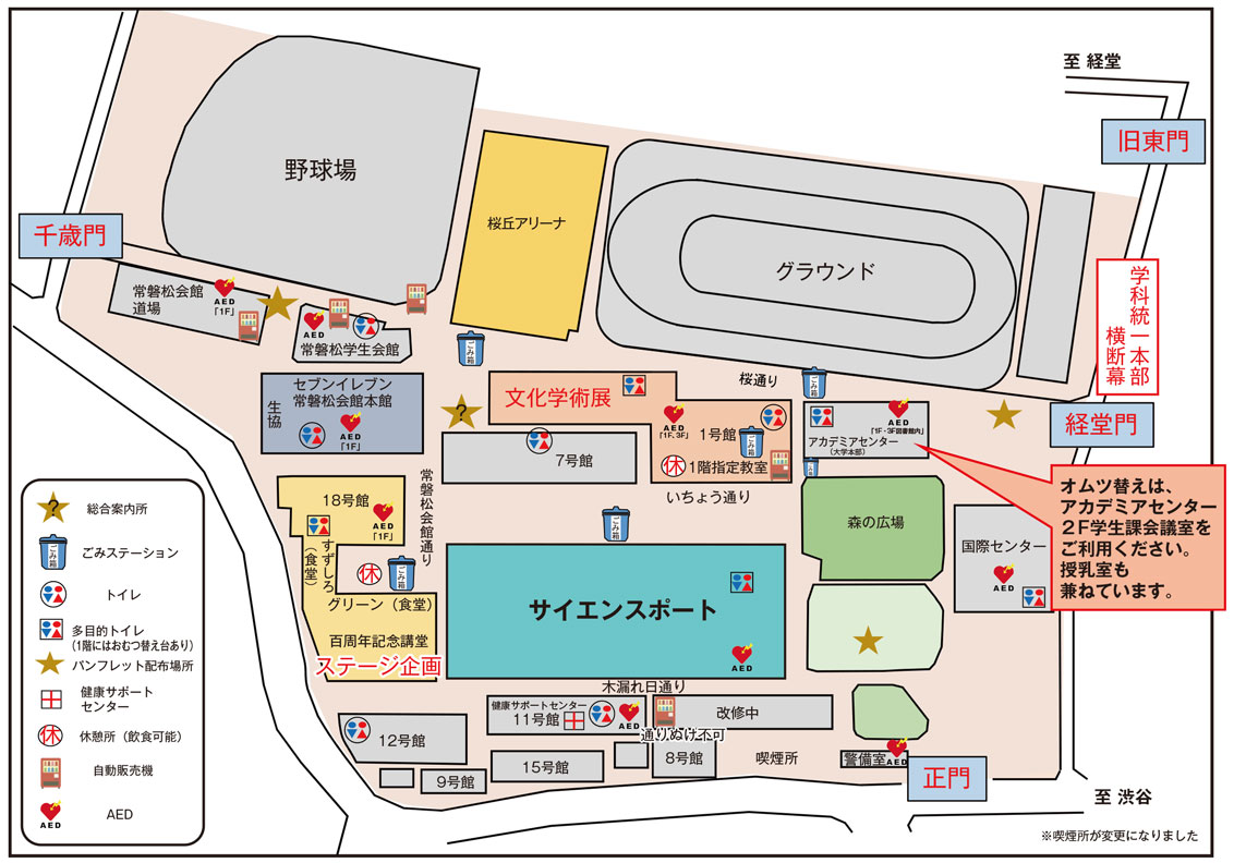 - 健康サポートセンターではオムツ替え、授乳をすることができません。おむつ替え台は1号館・18号館・サイエンスポート・アカデミアセンター・国際センター(各1階)の多目的トイレ内に設置しています。また、授乳はアカデミアセンター2階学生課会議室をご利用ください。なお、学内施設ではお湯の提供を実施しておりません。ご持参いただきますよう、お願いいたします。